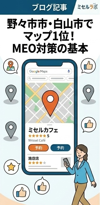 「野々市市 美容室」「白山市 ランチ」「近くの整体」──こんなキーワードでGoogleマップを使って検索するお客様が急増しています。MEO対策(Map Engine Optimization)とは、Googleマップの検索結果で自分のお店を上位表示させるための施策です。野々市市・白山市の地域密着型ビジネスにとって、MEO対策は集客の最重要課題の一つと言えます。本記事では、ミセルラボが野々市市・白山市のMEO対策について徹底解説します。