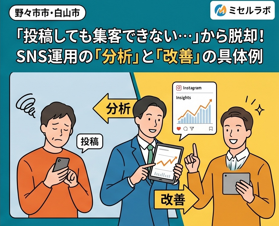 「毎日Instagramに投稿しているのに、フォロワーが増えない」「いいねはつくのに来店につながらない」「SNSが集客に効いているのかどうかわからない」——野々市市・白山市で店舗を経営するオーナー様から、このようなSNS集客に関するお悩みを日々いただきます。この記事では、SNS運用が集客につながらない根本原因と、データに基づいた分析・改善の具体的な方法をミセルラボが解説します。
